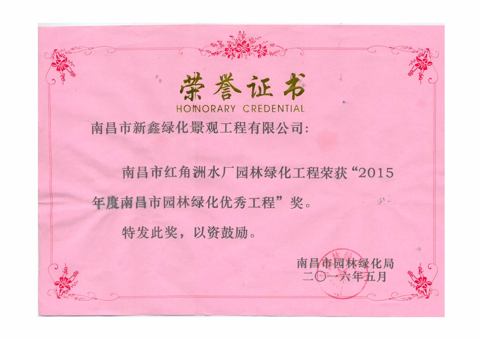 紅角洲水廠園林綠化工程獲得“2015年南昌市園林綠...